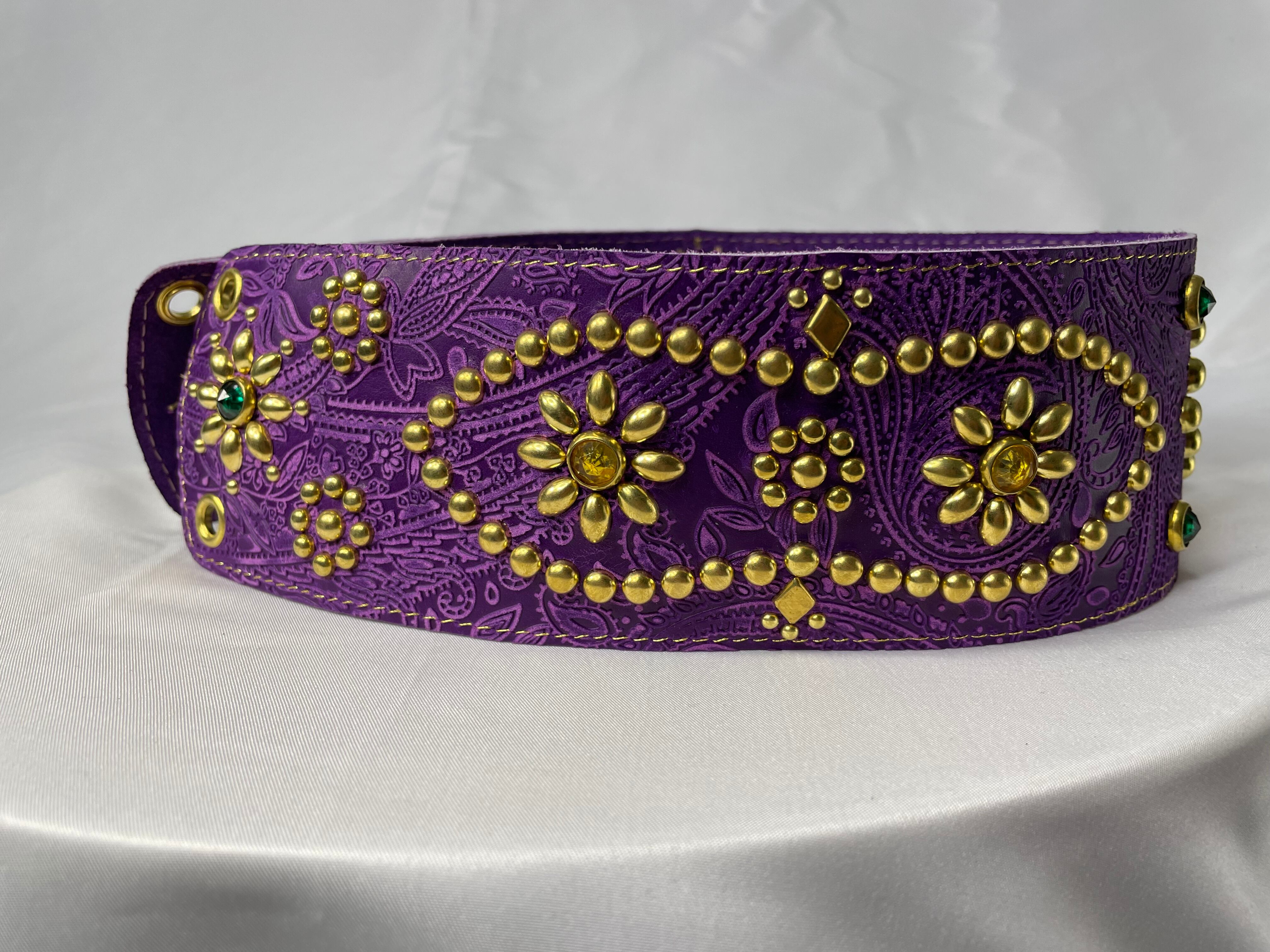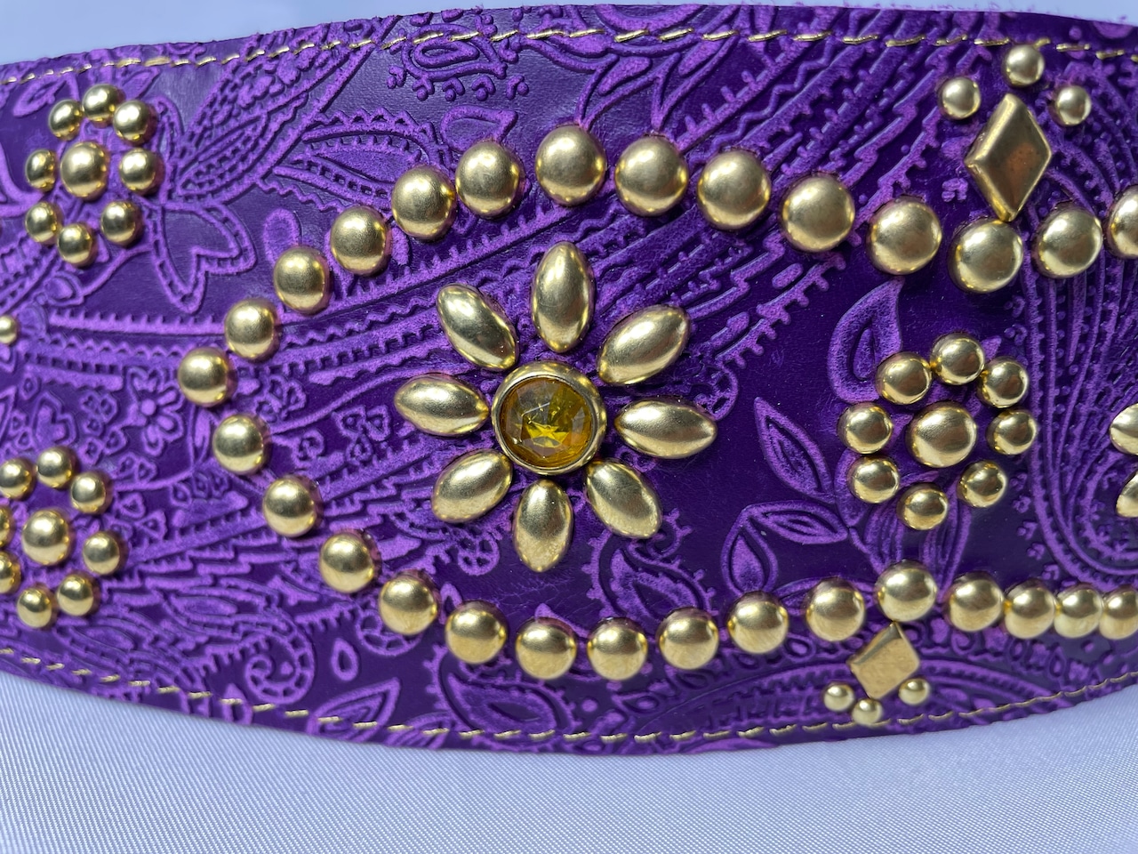 姫路レザーにペイズリーの型押しを施し、更に松本が自らデザインしたスタッズをこれでもかと打ち込んだ夢弦流らしさを詰め込んだ逸品