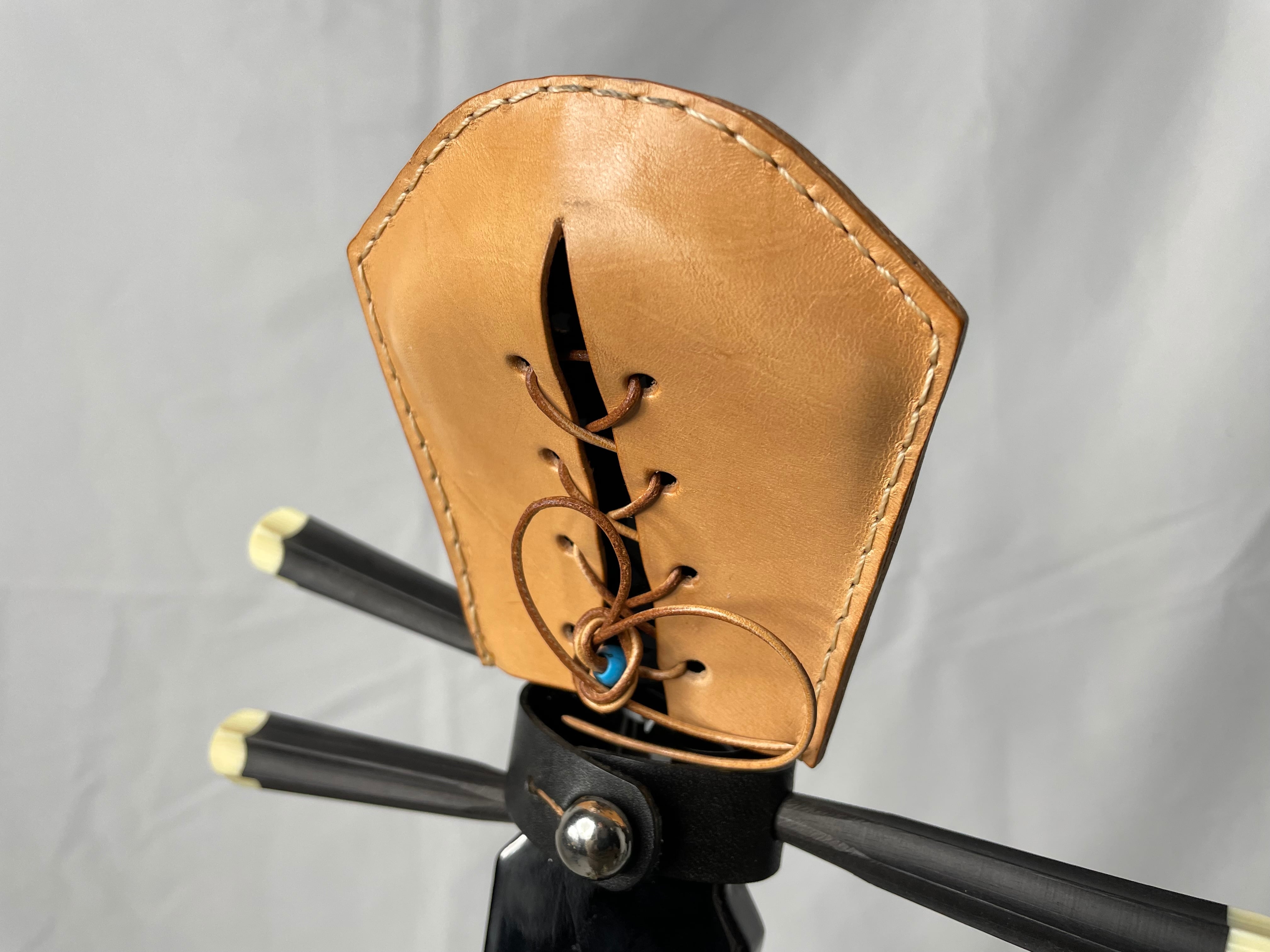 ヘッドの保護という用途を超えて三線をリデザインするというテーマを掲げ、どんなヘッド形状の三線に装着してもカッコよく見えるようにデザインしました。こちらのver2では人工ターコイズをアクセントに使用しております